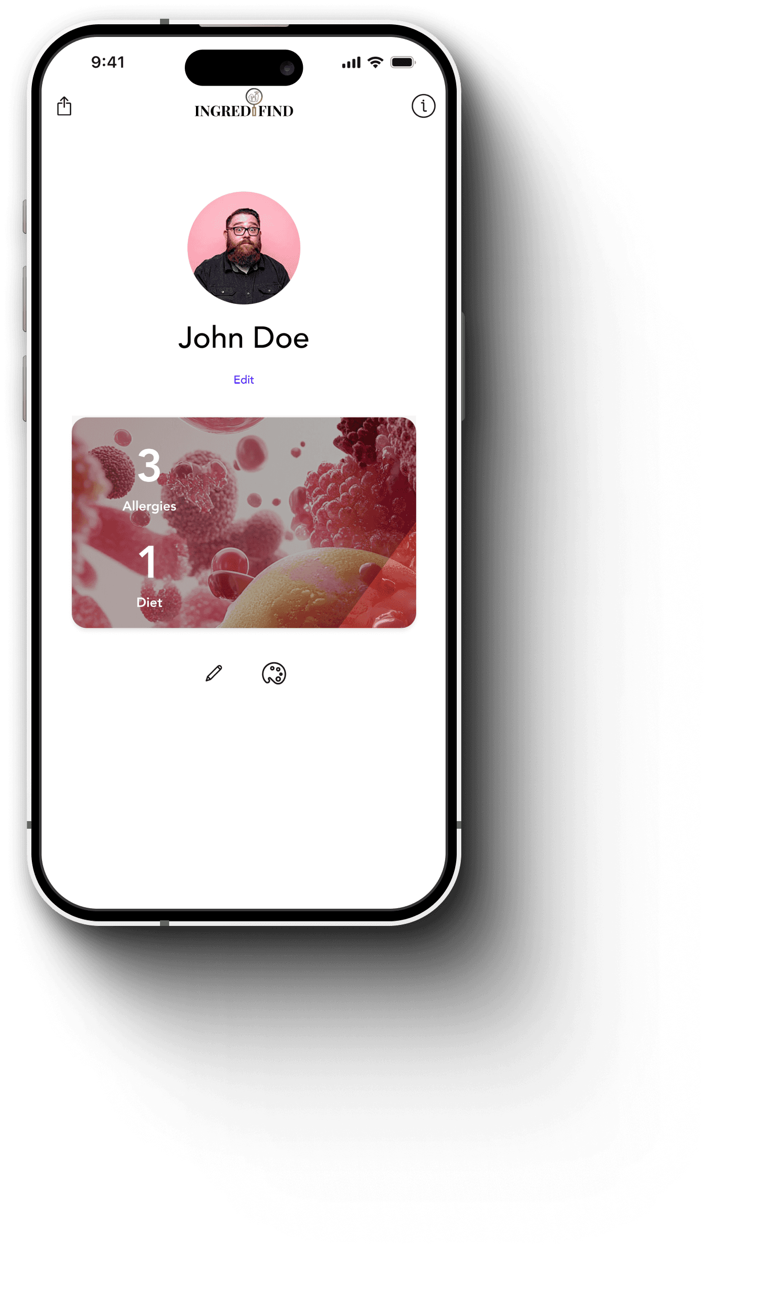 The profile view gives each user a simple, reassuring overview of their allergies and dietary preferences.