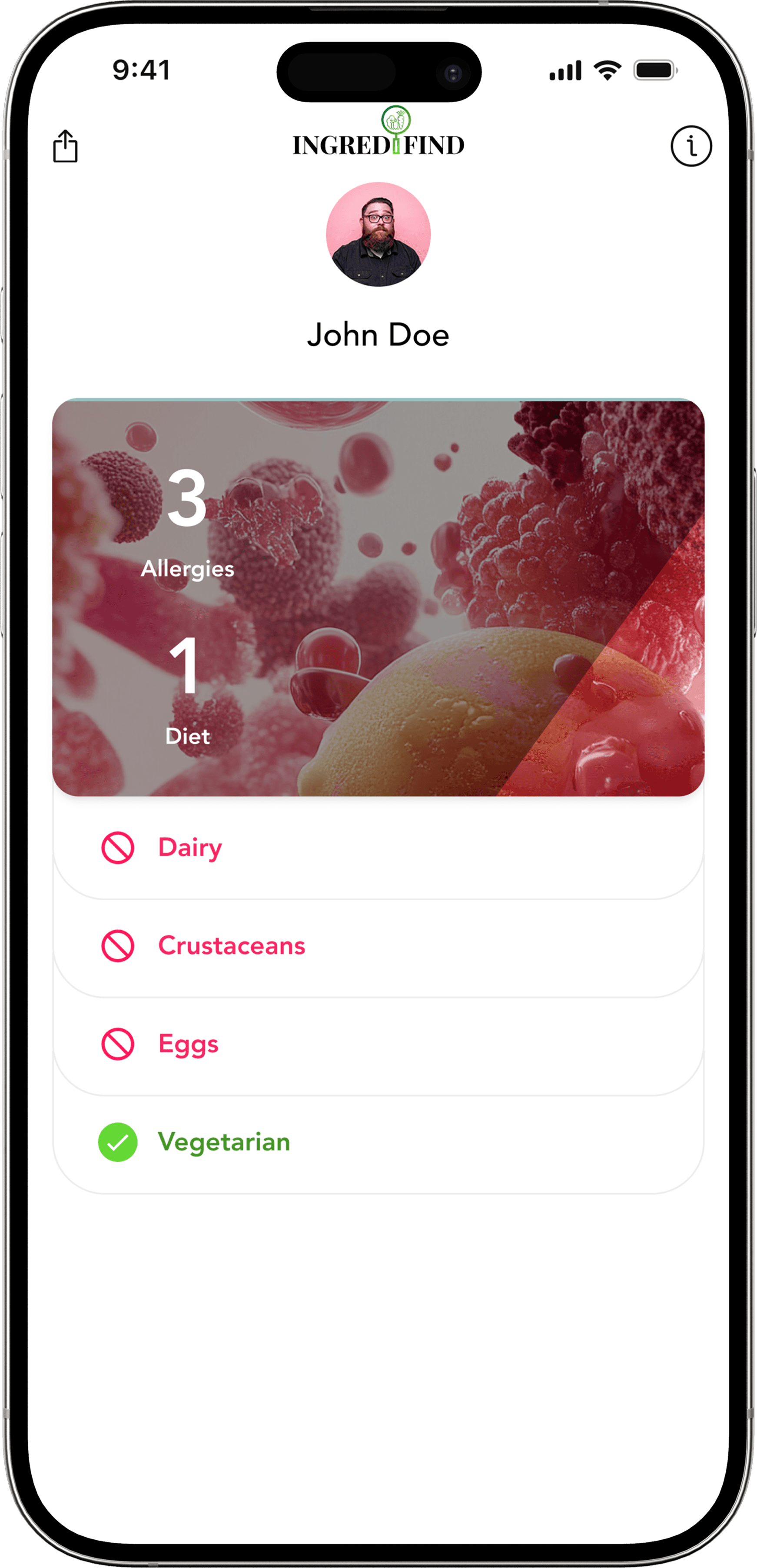 The allergen card itself presents information in a clean, visual hierarchy with colour-coded states (red for allergens, green for safe preferences).