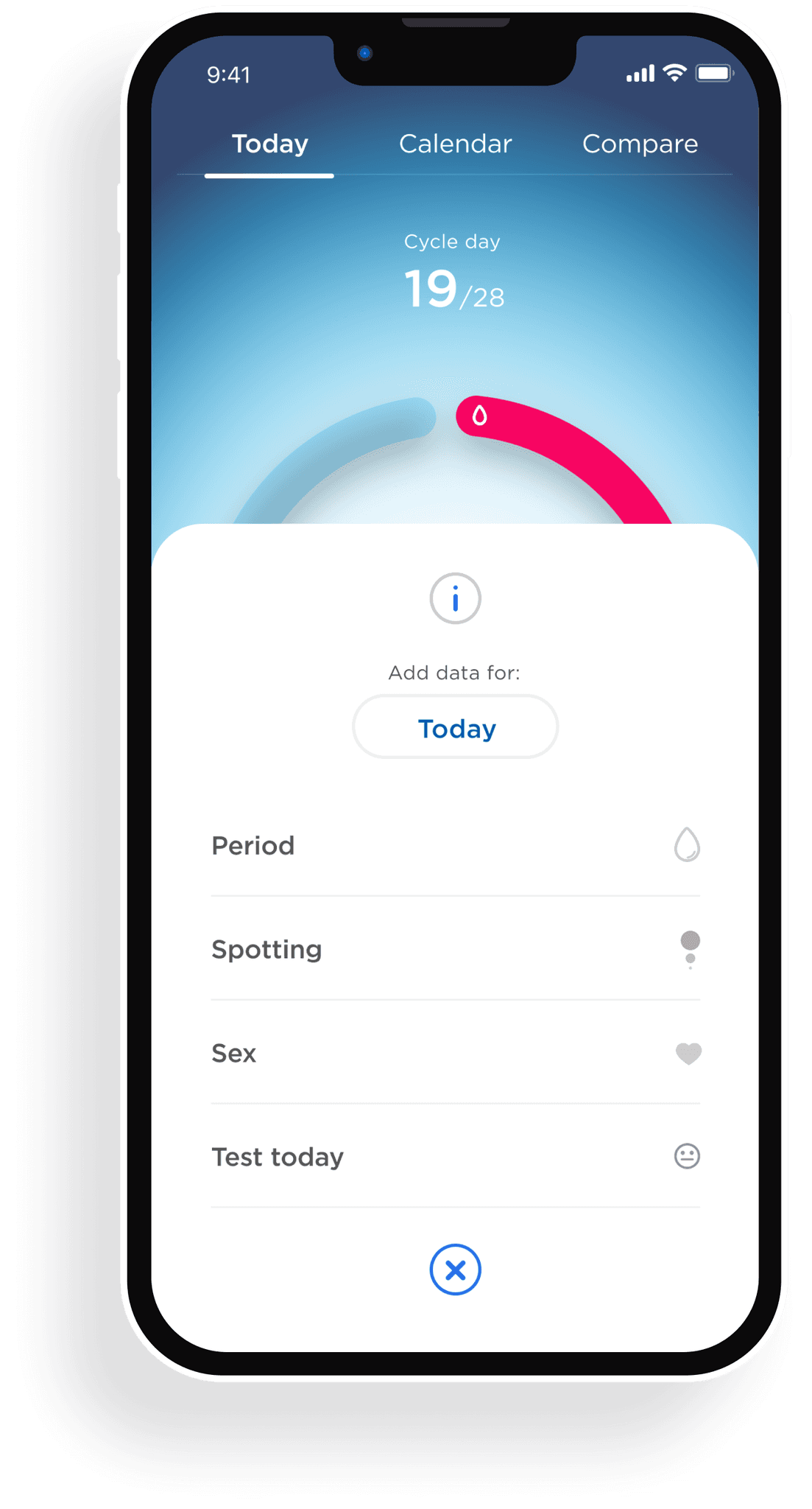 The “Add data” interface is minimal, friendly, and non-invasive, making it easy for users to track key symptoms, test days, and sexual activity, crucial for accuracy and personalisation.